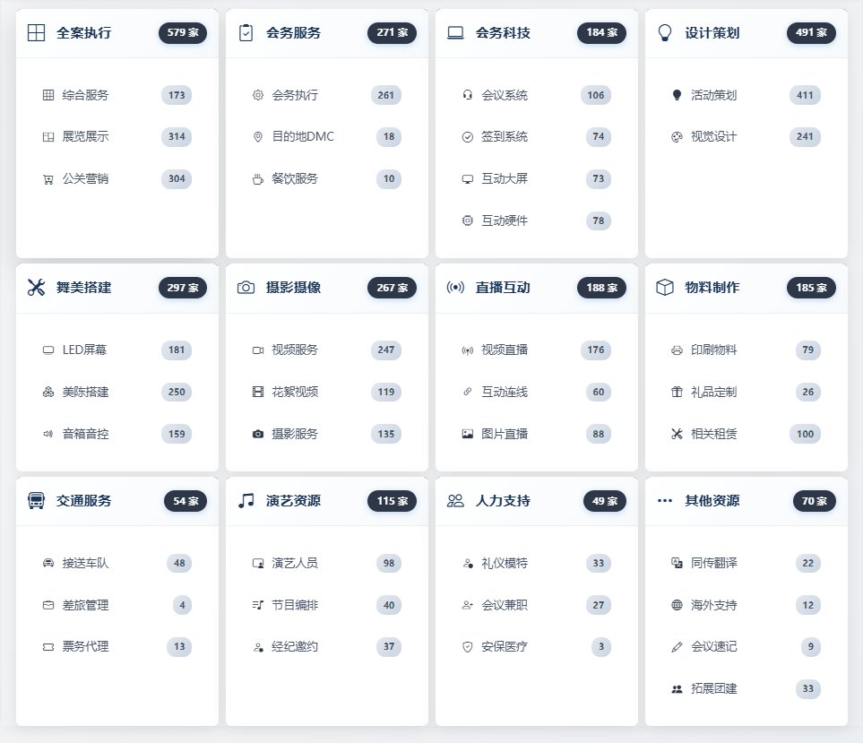 平台首创12大专业分类体系,覆盖全会议产业链,从全案执行、会务服务、设计策划,到舞美搭建、摄影摄像、直播互动、物料制作、交通人力等,一站式囊括所有会议服务需求;同时覆盖北京、上海、广州、深圳等一线城市,成都、杭州、武汉、西安等新一线城市,服务网络持续扩张,全国客户都能精准匹配。